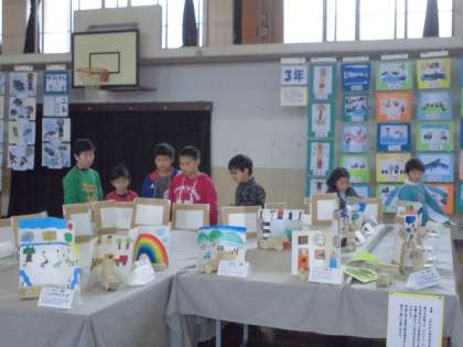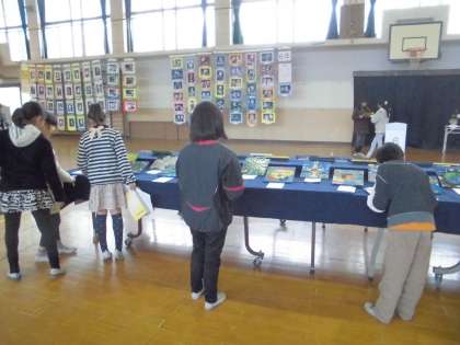 今日は4年生が体育館で行われている図工の作品展を見に行きました。普段と違い,他学年の作品が見られるので子ども達も楽しみにしていました。
