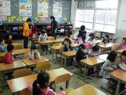 1年生が登校したら,6年生が1年生の教室まで手をつないで一緒に行き,かばんの中身を机の中に入れるのを手伝います。本日から,来週一週間,1年生のためにがんばります。