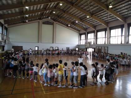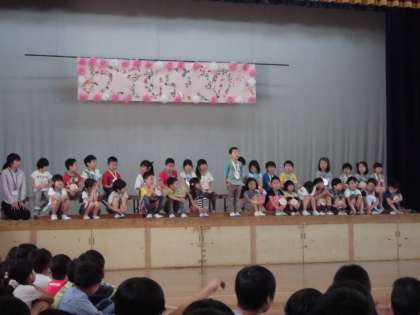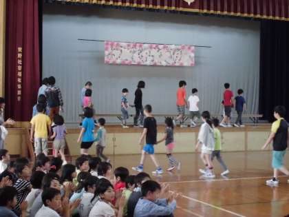 5月15日(金)3校時「1年生を迎える会」がありました。手作りメダルを首にかけ,6年生に手をつないでもらって,32名のかわいい1年生が入場してきました。1年生は,舞台の上で一人ずつ,自分の名前と好きなことを大きな声で発表しました。とてもしっかり発表できました。その後,全校で「○×クイズ」や「貨物列車」を楽しみました。「貨物列車」では、最後に長い列車がつながり全校の輪が出来上がりました。1年生を温かく迎える集会になりました。