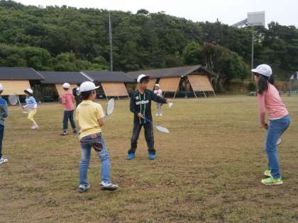 グループ活動では、サッカーやバドミントン、アスレチックなど、たくさんの物を、広い芝生で楽しみました。たまにぽつぽつ雨がありますが、肝試しはできそうです。