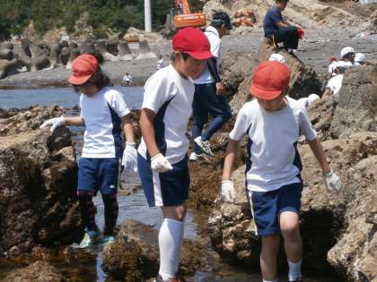 マリンランドの先生のお話を聞いた後、自分たちで探しました。大きな岩をのけたり、水に顔を近づけたりすると、いっぱい見つけられました。ヤドカリや、小さな魚、サザエやアメフラシ、タコまで見つけた人もいました。いっぱいのものを見つけられて、とてもうれしく満足しました。