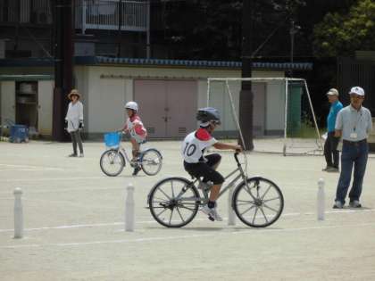 6月2日(火)北警察,紫野交通対策協議会,PTAの方々にお世話になり,4年生の自転車免許教室を行いました。コースの説明を聞いた後,自分に合う自転車を選び,練習をしました。その時は,交通対策協議会やPTAの方から,ポイントで気をつけることを教えていただきました。いよいよ本番です。「右見て、左見て」と言いながら,慎重に運転していました。結果が楽しみです。