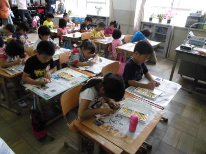 グループ活動や作品作りをする姿も見られました。1年生は,図画工作の時間にハサミの使い方を学習し,手を繋いだ人を作り,絵を描きました。3年生は,理科の学習で学んだ昆虫の体のつくりを思い出しながら,オリジナルの昆虫を作りました。5年生は,地図を見ながら気候の特徴について班で話し合い学習を進めていました。