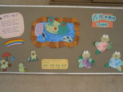 6月に入り,梅雨に入りました。アジサイもきれいです。掲示板は用務員さんが季節の掲示物を作ってくれています。じめじめしてきますが,食中毒にならないように,しっかり手洗いしてください。