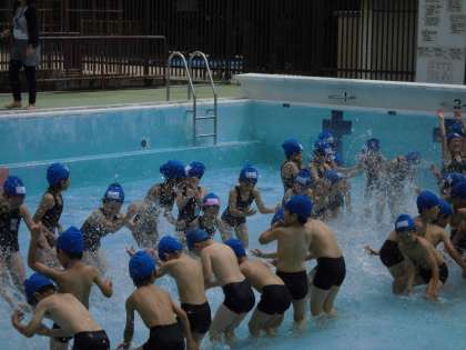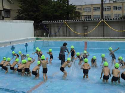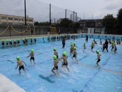 今日から,低水位での水遊びが始まりました。1年生は,小学校の大きなプールに入るのを楽しみにしていたことと思います。2年生のお兄さん・お姉さんにプールでの約束を教わりながら,水かけをしたり,いろいろな動物のまねをしたり,楽しく学習しました。次のプール学習が楽しみですね。