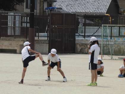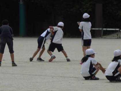 4年生は,体育の学習で「すもうあそび」をしています。どうやって押したらいいか,どうやったら力が入るかチームで考えながら行っています。