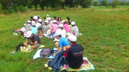 平城京跡でお弁当を食べ,午後からは班でスタンプラリーをしながら平城京跡を散策しています。午前中に東大寺で見学した大仏はとても大きく,平城京跡はとても広かったです。