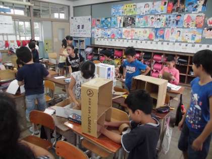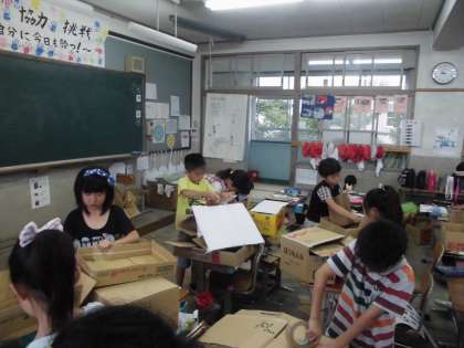 図工の「べんりなマイボックス」の学習の様子です。段ボールを使って,自分だけの箱を作っています。切ったり,ひっつけたりしながら組み立てています。まだ,完成はしていませんが,今から完成するのが楽しみです。