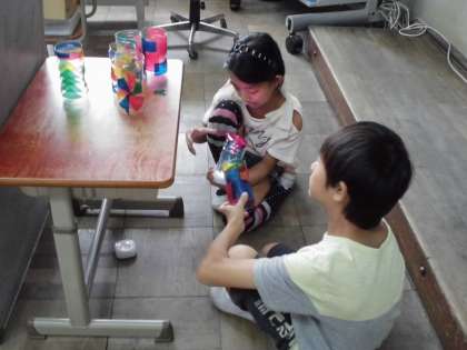 3年生が,京都造形芸術大学の学生さんと8月の「京の七夕」で飾る『ランタン』を作りました。きれいな色のセロファンを好きな形に切り,ペットボトルに貼って飾っていきます。最後に星型の短冊に願いごとも書きました。ランタンを光の上に飾るときっときれいだろうなと楽しみにしています。