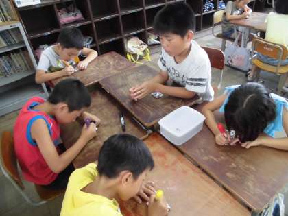 今日は登校日でした。夏休みが始まり,真っ黒に日焼けした楽しい笑顔を見せてくれました。ビー玉とアルミ箔を使って,ふしぎなたまごを作りました。なかなか上手にできなくて何度もやり直す人もいましたが、みんな楽しくて面白い、ふしぎなたまごができました。