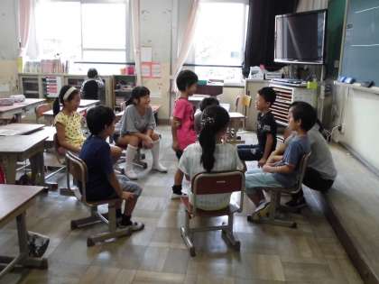 9月9日は,月1回のなかよしグループ(縦割りグループ)で遊ぶ日です。今日はあいにく朝から雨が降っていたので,鬼ごっこなどの運動場での遊びをしりとり・椅子とりゲーム・宝探しなどに変更し,リーダーを中心に仲良く遊ぶ姿が見られました