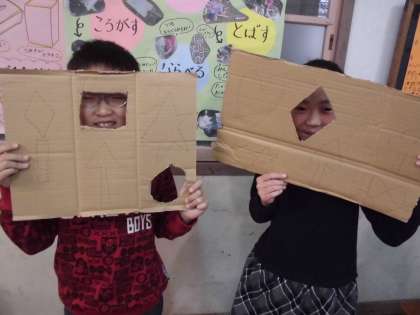 初めて,段ボールカッターにも挑戦しました。初めは怖がっている人もいましたが,お友達と協力しながら,思い思いの形を切り抜くことができました。