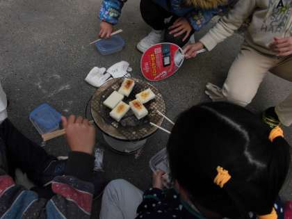 火を起こすのに苦労しましたが、丁度よい炭の火加減で、とてもおいしそうなおもちが焼きあがりました。
