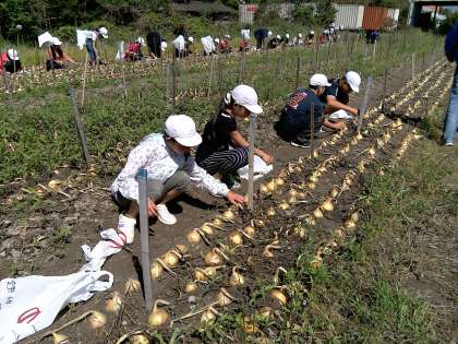 雲一つない澄み切った空のもと,バスは淡路島牧場に向かいました。淡路島牧場では,まず『玉ねぎほり』をしました。なんと20個も収穫した人もいました。「何個採れた?」と競っている人,「重い。どうやって持って帰ろう・・・」と悩んでいる人もいました。この後,乳絞りの体験をします。