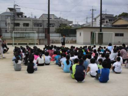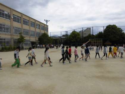 今年度初めての避難訓練は,不審者が学校に侵入してきた場合を想定しての訓練でした。各教室で事前指導を受けての訓練では,みんな真剣な態度で訓練に臨むことができていました。今回は,近くの船岡乳児保育所のみんなと一緒に訓練をしました。