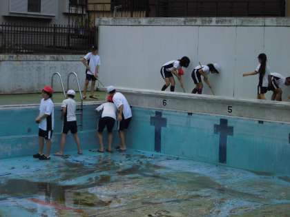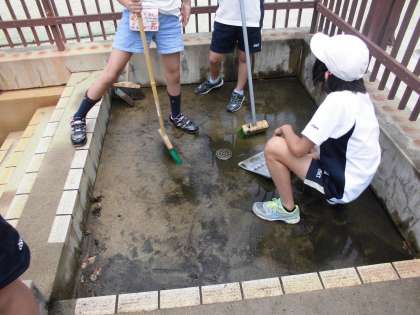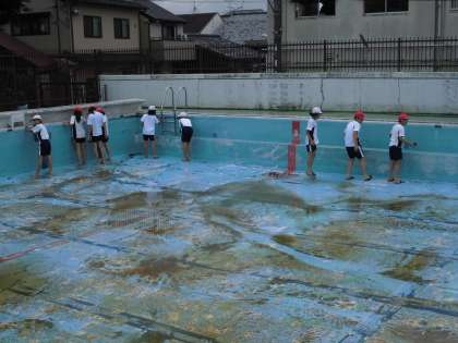 来週から始まる水慣れ・水泳学習に向けて,プール清掃を行いました。1年分の汚れが,プールの周り・プールの中にたまっているので,一人一人ががんばらないと汚れがとれません。たわしやブラシを持って,ごしごし磨きました。