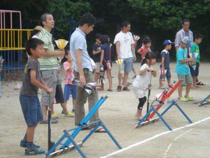 日曜参観が終わった午後からは,「おやじの会」主催の“ペットボトルロケット大会”です。今年は参加人数が多く,特に1年生の参加がとても多かったです。工夫して作ったペットボトルは,空高く飛び上がり,大きな歓声が上がっていました。