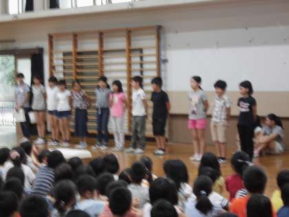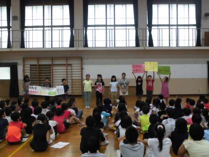 今年度初めての「児童集会」がありました。始めに,飼育委員から「2羽のうさぎさん」についてのクイズがありました。紫野小学校にいる“ゆき”と“くろまる”も,紫野小学校に来て2年目になります。これからもっともっと子ども達と関わって,絆を深めてほしいと思います。続いて,計画・代表委員から今年度の紫野小学校児童会の目標が発表されました。目標は,『みんな あかるく たのしく にこにこ 紫野』です。そのために,全校みんなが「仲良く遊ぶ」「元気に登校する」「あいさつをする」を心がけていってほしいです。