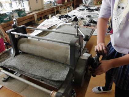 6年生は,自分の笑顔をドライポイントという技法を使って版画の作品を制作しています。自分の顔をビニル版に写し取り,ニードルで彫り上げた版を刷っています。