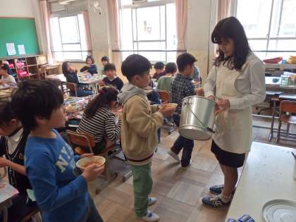 4年生は,元気なあいさつで給食をもらいに行きました。おかずの増やしの列もできていました。