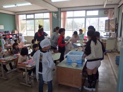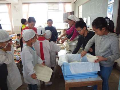 先週から始まった給食ですが,1年生はわからないことばかり…。そこで5年生のお兄さん,お姉さんがお手伝い!食器におかずを入れたり,配膳をしたり,優しく教えています。早く1年生だけでできるようになるといいですね。