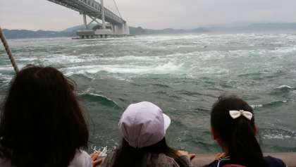 大鳴門橋に近づくと,船が左右前後に揺れるくらいの大きな潮の流れ。