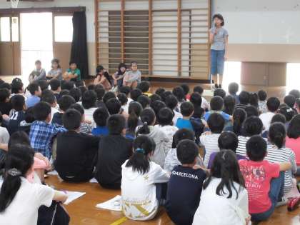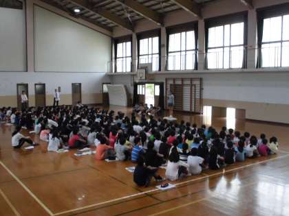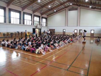今日は「なかよし集会」が行われました。1年生から6年生で1つのグループを作り,そのグループで遊んだり給食を食べたりします。今日はそのグループの初顔合せ。まずは,グループで教室に集まり,6年生を中心として自己紹介をしました。そして,「なかよしあそび」の日にグループで何をして遊ぶかを決めました。その後,全グループが体育館に集まり,各委員会の委員長より活動内容やみんなへのお願いなどの話がありました。どの学年とも仲良くできる良い機会です。これからの活動が楽しみです。