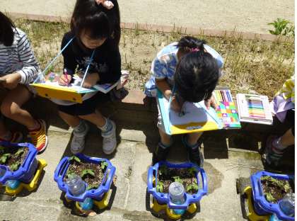 今日は生活科の時間に,あさがおの芽の観察をしました。においをかいだり,葉を触ってみて,「やわらかい!」と驚く子や,よく茎を見て,茎の色の違いに気がついた子もいました。これからどんどん大きく育てていきましょうね!