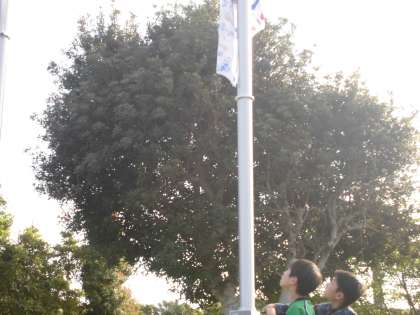 昨日の夕方に降ろした旗を、校歌に合わせて再度掲げました。
