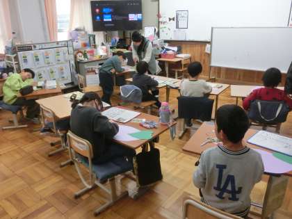 さつまいもクッキングの活動を新聞にまとめます。自分のコーナーを一生懸命書いたり飾ったり。できあがりが楽しみです。