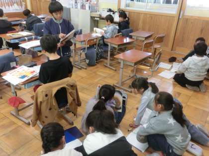 国語科では「三年とうげ」というお話を通して学習をしています。おもしろいな、と感じたところをまとめたり交流したり。また、このお話から波及して民話や昔話に触れ、お気に入りのお話を紹介しあっています。読書の世界が広がりますね。