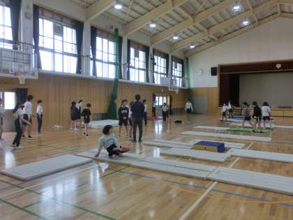 体育科ではマット運動に取り組んでいます。自分に合ったねらい・めあてにむけ、活動しています。ねらいに応じた場づくりもスムーズです。