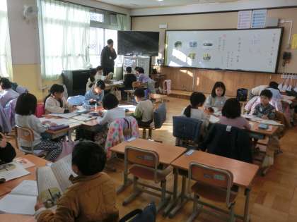 国語科「たぬきの糸車」の学習です。お話を読んで考えた「?」(はてな=どうしてかな?なぜかな?と感じたこと)についてお友だちとたくさん話しました。「たぬきが糸車を回すまねをしていたのはどうしてかな?」「どうしてわなにかかったたぬきをたすけるの?」と、いろんなはてなについて、お友だちの意見にも触れ、考えを深めました。