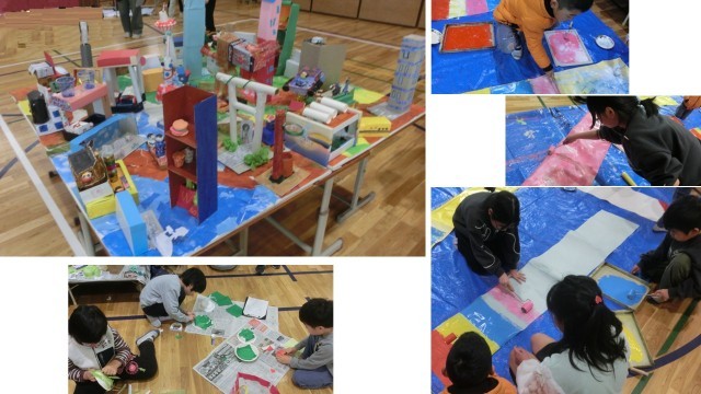 今日はみんなの作品をディスプレイし、その装飾等の作成に取り組みました。山や道などを作ったり、ディスプレイ台の飾りを作ったり。思い思いに作業を楽しむことができました。