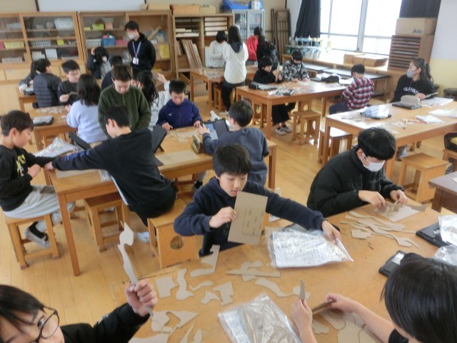 図画工作科では、糸のこを使って板材を切り、形を見たてながら造形しています。