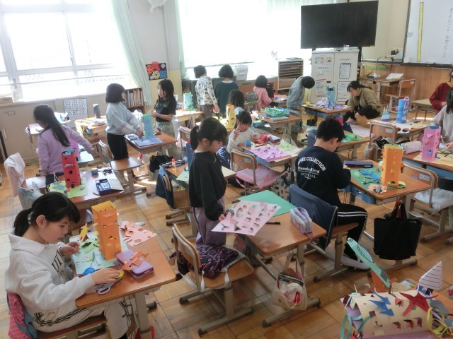 図画工作科「まどをあけたら」の創作活動です。まどからはあんなものやこんなものがひょっこりと…。とっても夢のある、素敵な作品になっています。