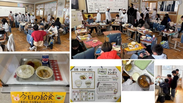 そして今日の給食は、卒業お祝い献立の「トンカツ」でした!給食調理員さんが一つ一つ衣をつけてあげてくださり、ソースも手作りです。おいしかったですね!そしてお昼の放送では、1年生の代表さんが、6年生との思い出を話してくれました。嬉しいひと時となりました。