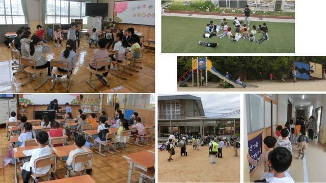 1年生はドキドキの初日。校内のいろいろなところを歩いて回ったり、みんなで遊んだりしました。帰りは集団下校です。