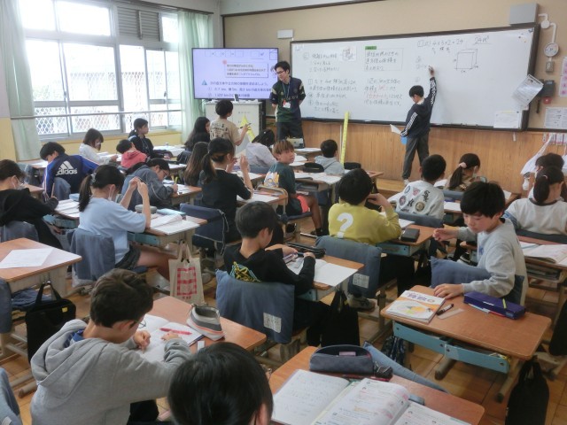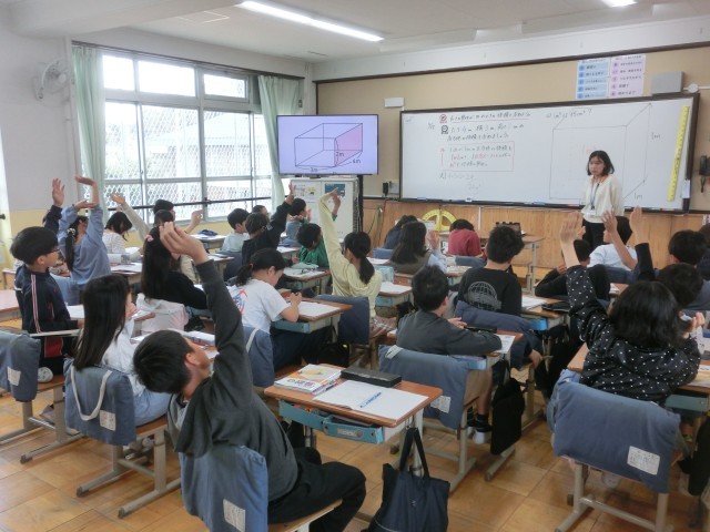 算数科では、長さの単位が「m」のときの体積の求め方を考えました。計算して、単位を確認して…今日の学びを今後にも活用していきます。