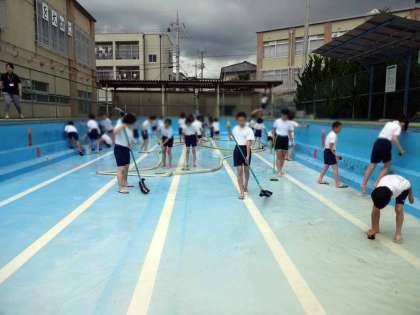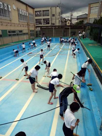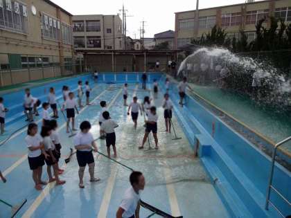 8日(木)の5校時,5・6年生がまもなく始まる水泳学習にむけプール掃除をしました。5・6年生はプールの底や壁,プールサイドなどをしっかりこすり,全校のみんなが気持ちよく水泳学習できるようにしてくれました。今年も消防分団の方々が準備から仕上げまでお手伝いしてくださり,とてもきれいにすることができました。ありがとうございました。