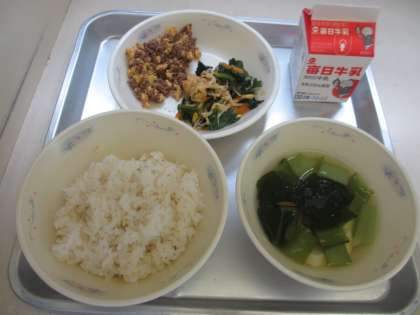 今日は子どもたちに大人気の『ビビンバ』でした。1年生はビビンバの具がお皿からこぼれないように,そおっと混ぜていたり,お隣の席の子と混ぜ方を相談したりしている子もいました。