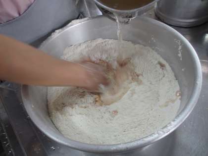 だご汁は,九州の郷土料理です。小麦粉を練って作るだんごにトマトの果汁を加えました。ピンク色のだんごでさわやかな酸味がおいしい『トマトだご汁』ができました。だんごだけではなく,汁にも角切りのトマトを入れました。