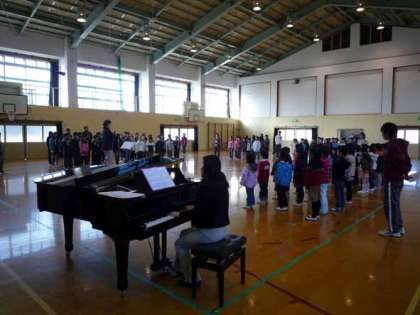 みんなで「世界が一つになるまで」と「夢の世界を」を合唱しました。体育館は少し寒かったのですが,一年間のまとめにふさわしい響きのあるきれいな歌声で歌うことができました。