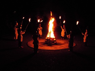 まずは,火の神から火の子が火をもらいキャンプファイヤーに火をつけます。