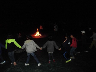 歌とともに燃え上がる炎。その炎を中心にして歌ったり踊ったりゲームをしたり,2校一緒に盛り上がりました。