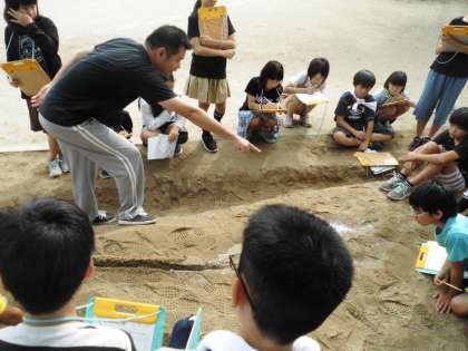 ホースで水を流すと,少しずつ川ができていきました。水が山を削っていく様子に,歓声が上がりました。下流で流れが曲がると,川の中の石や砂の様子が変わり,子ども達は興味津々でした。