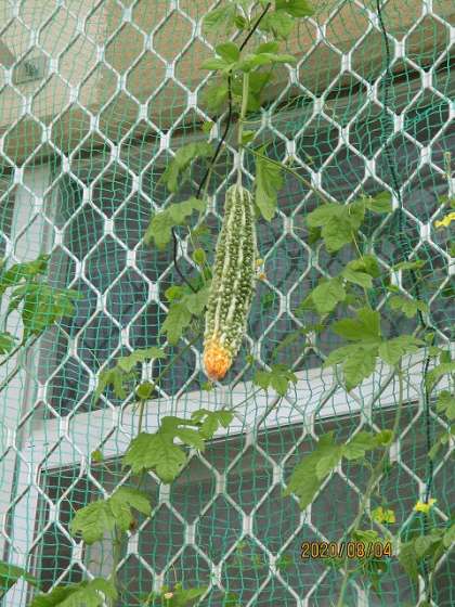 毎日草花に水やりをしています。花はきれいに咲き,ツルレイシには大きな実ができていました。