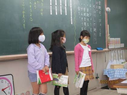 かえるくんやがまくんの気持ちを表現できるよう,優しく読んだり,急ぐように読んだり。ナレーションを一緒に読んだり交互に読んだりと,子ども達は様々な工夫を凝らして発表しました。