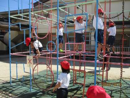 今日は体育科の「ようぐあそび」で総合遊具を使い,運動しました。