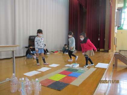 体育館で,実際に自分達で作ったおもちゃを使い練習しました。